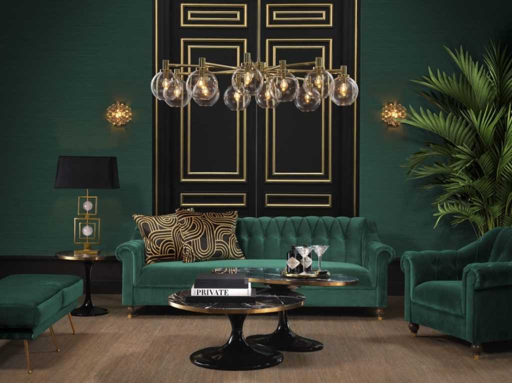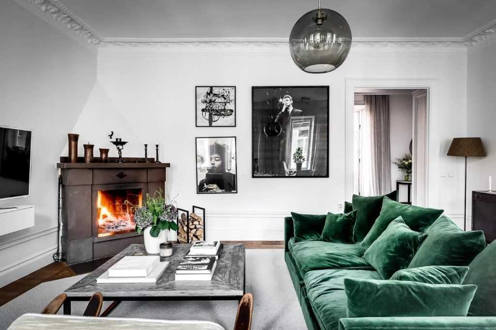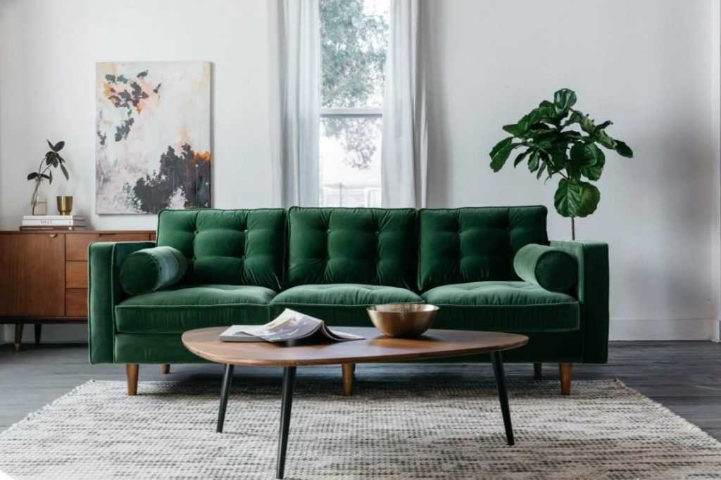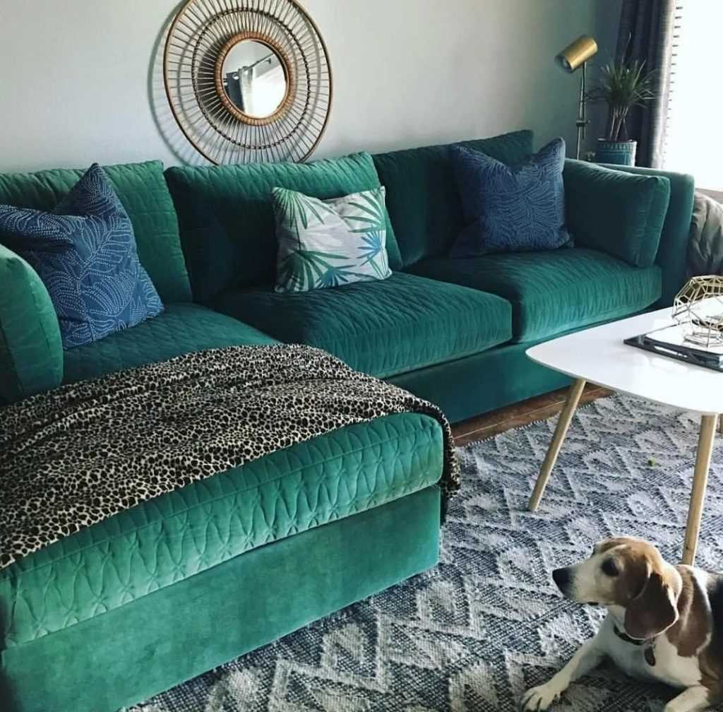 Для его преображения и расстановки ярких акцентов, поставьте в комнате изумрудный диван.
