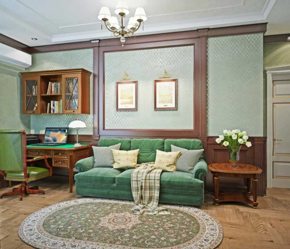 Для этих целей используют мягкие оттенки. Такие тона зеленого хорошо комбинировать с насыщенными коричневыми и серыми тонами. В подобном декоре уместны аксессуары бордового и синего цвета.