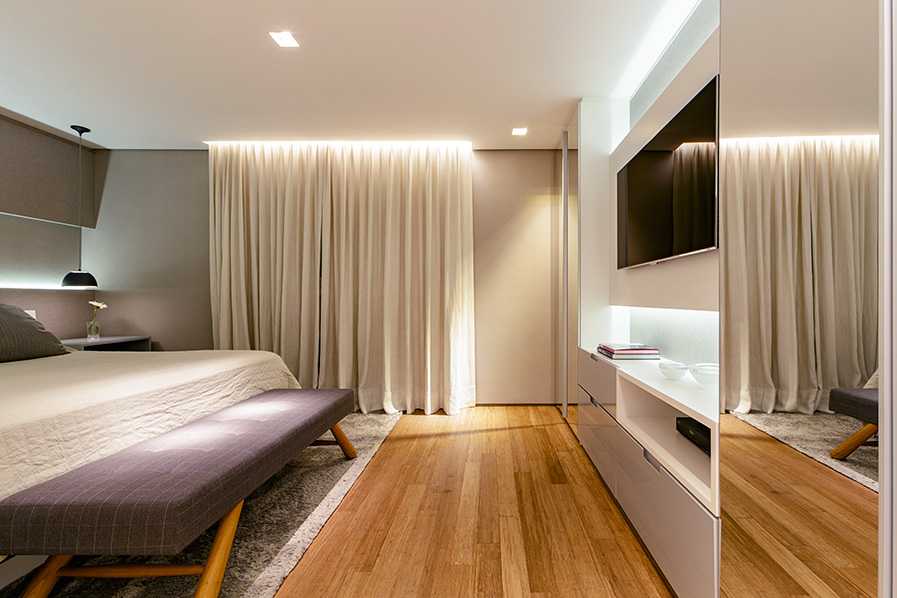 Традиционный комплект мебели для спальни: двуспальная кровать, шкаф-купе, комод или туалетный столик. Набор дополнительных элементов мебельного гарнитура зависит от концепции дизайна, целеполагания. Зачастую в спальных оборудуют небольшой рабочий уголок, для этого комнату лучше зонировать.