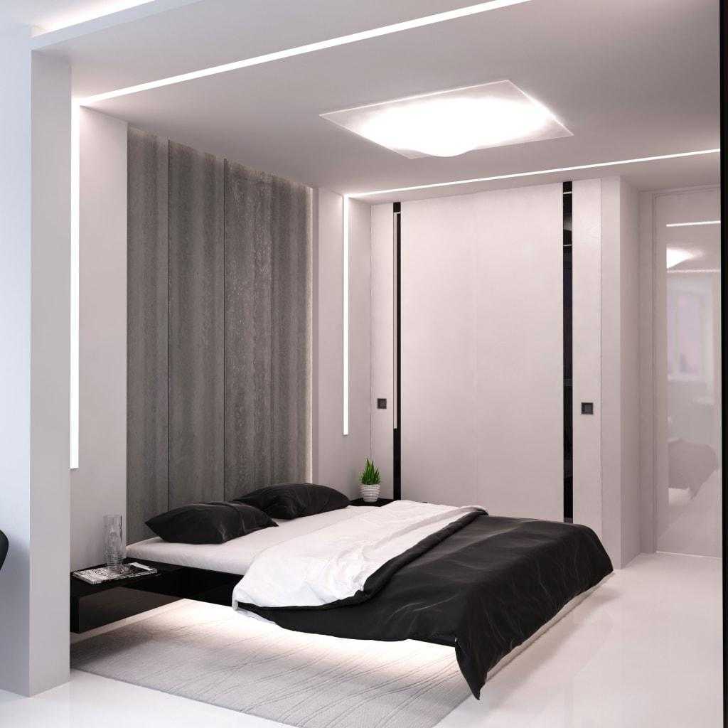 Потолок. Потолок в минималистичной спальне простой, как и весь остальной интерьер. На нем не должно быть ярких декоров, лепнины или бордюров. Оптимальный цвет для оформления потолка – белый или бежевый. Допускается и более интересное оформление: гипсокартонная конструкция строгой геометрической формы, в которую будут вмонтированы точечные светильники. Самое простое, бюджетное и современной решение — матовые натяжные потолки.