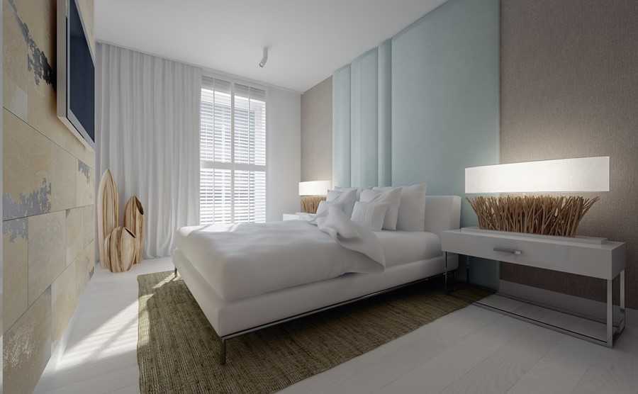 Допускаются акценты в виде картин, изысканных торшеров, керамических фигур, комнатных растений. Постельное белье должно быть шелковым либо хлопковым, без заметных принтов. Точечное светодиодное освещение по периметру и прикроватные бра с матовыми молочно-белыми плафонами помогут создать спокойную атмосферу и настроиться на безмятежный сон.