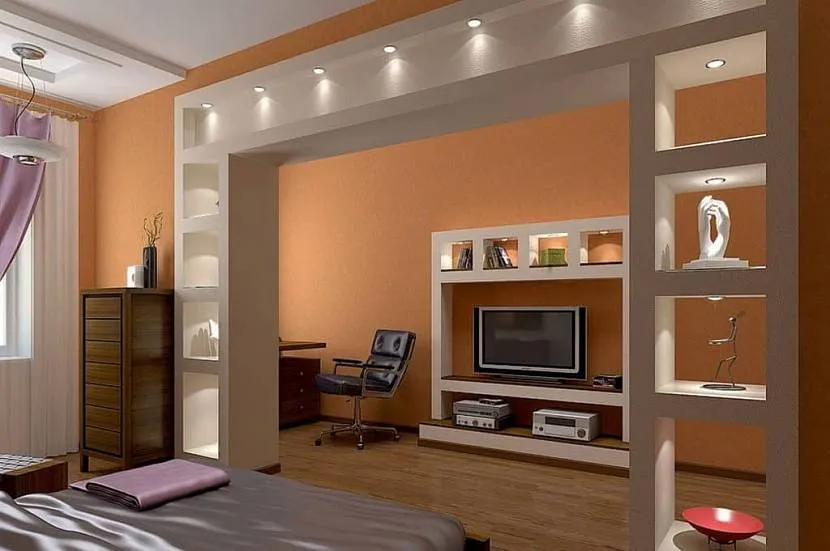 В прямой перегородке из гипсокартона может разместиться стеллаж для декоративных аксессуаров, приглушенное освещение ниш добавит комнате таинственностиИсточник peregorodkainfo.ru