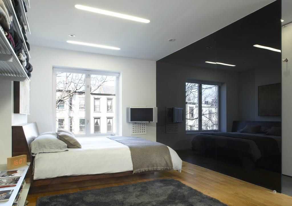Стеклянная стена — самое адекватное решение при зонировании комнаты с одним окном. Если, например, необходимо отделить зону спальни в квартире-студии, поставьте стеклянную перегородку. На ночь ее можно закрывать шторами, создавая уединенность, а днем в эту зону будет беспрепятственно проникать свет.