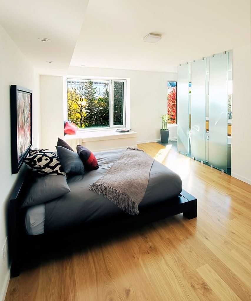 Современный интерьер спальни со стеклянной перегородкой в ванную комнату