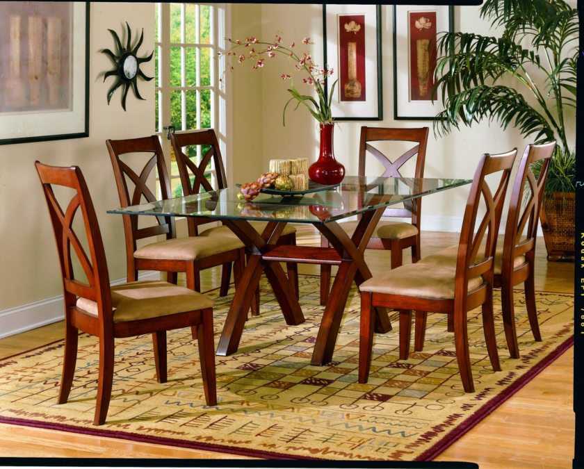 - Для классического стиля, идеальным вариантом станет сочетание стола из стеклянной столешницы с изящным деревянным основанием. Также столешница может иметь окантовку из дерева. Стулья для такого стола лучше всего выбрать стулья из дерева.