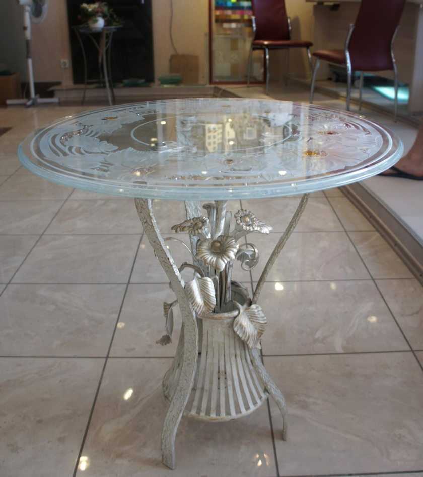 - В этническом стиле и кантри стеклянные столы тоже будут не менее оригинально смотреться. Ну а стеклянные столы круглой формы, выполненные на кованной фигурной основе превосходно впишутся в любое помещение.