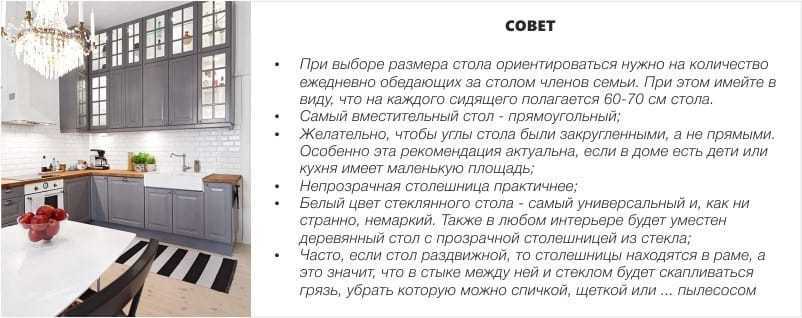 - Размер столешницы. Чтобы обеспечить комфорт членам семьи, рассчитайте, что на каждого должно приходиться до 70 см.
