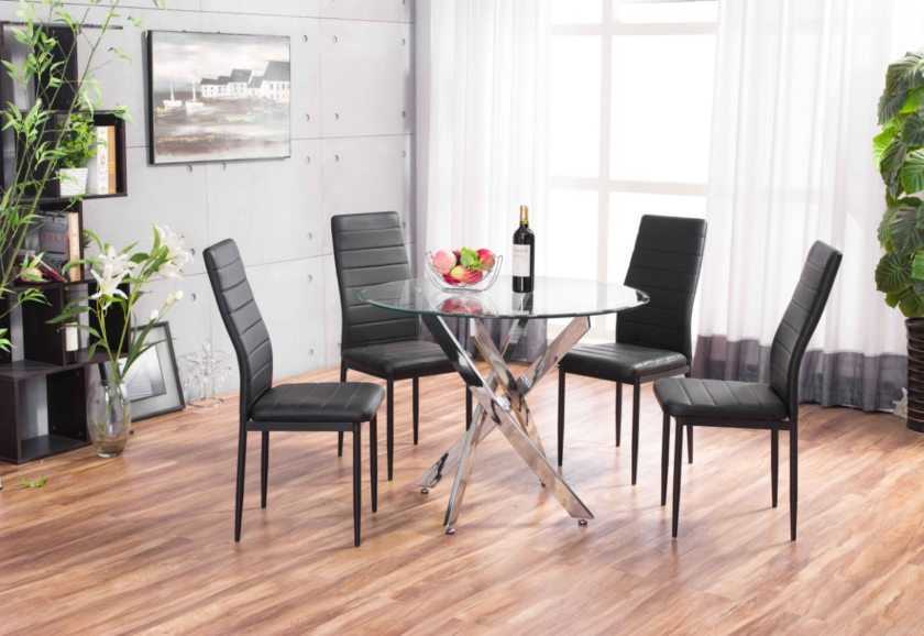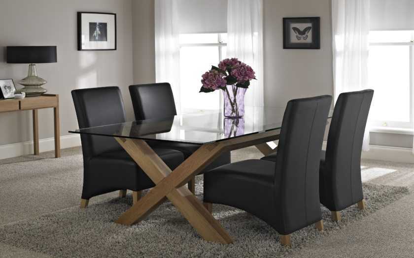 Классический вариант — обеденный стеклянный стол с четырьмя опорами. Он демонстрирует лучшие показатели стабильности изделия.