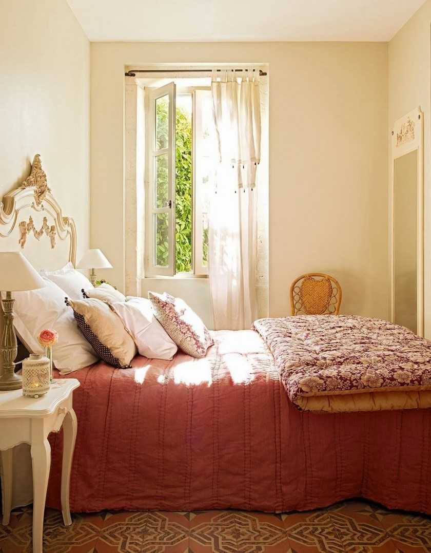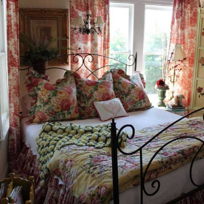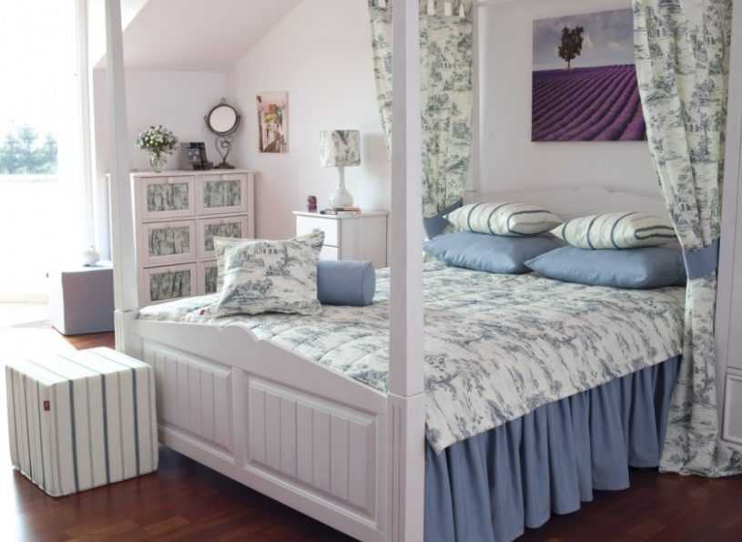 Для стиля прованс характерны большие кровати с коваными спинками, которые красят белой краской. Текстиль может быть однотонным пастельных цветов, украшенный кружевными вставками или нежным цветочным орнаментом.