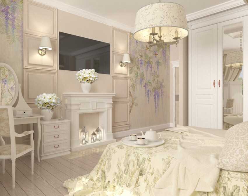 В интерьер спальни прекрасно впишутся комод и туалетный столик. На окна следует повесить воздушные шторы в классическом стиле.
