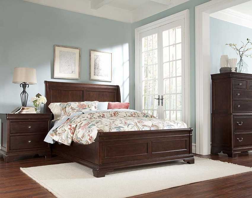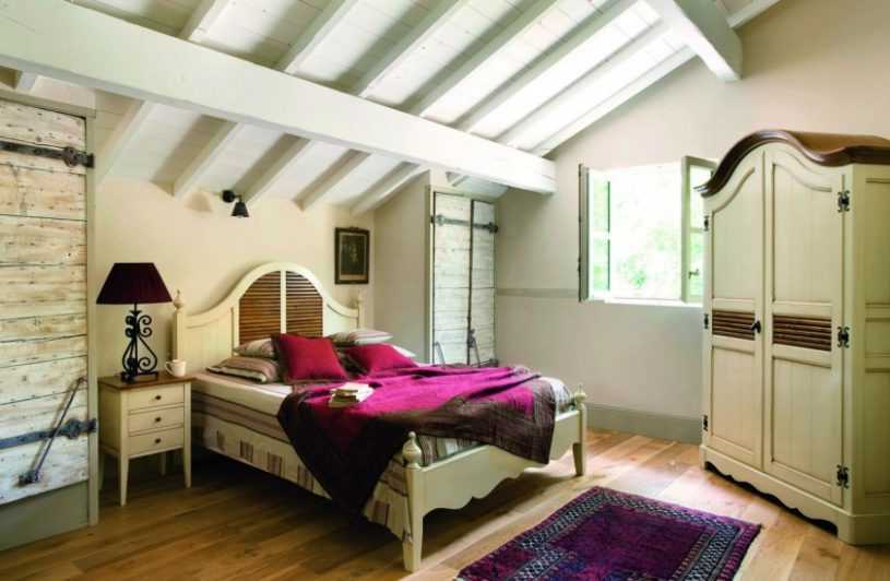 Древесина станет самым подходящим вариантом для создания французского деревенского стиля. При этом спальное ложе должно иметь образ старинного массивного предмета, с потертостями и патиной.