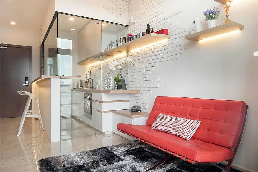 Современные комнаты в квартирах оформляют в стиле лофт. В помещении присутствуют стены из неприкрытого кирпича или бетона в комбинации с пластиковыми элементами и стеклянными осветительными приборами. На полу отлично смотрятся деревянные доски или бетонные плиты. В индустриальном интерьере оставляют открытые коммуникации, провода и трубы. Кухню объединенную с гостиной обставляют деревянной меблировкой с грубой фактурой, украшают медным, латунным и кожаным декором.