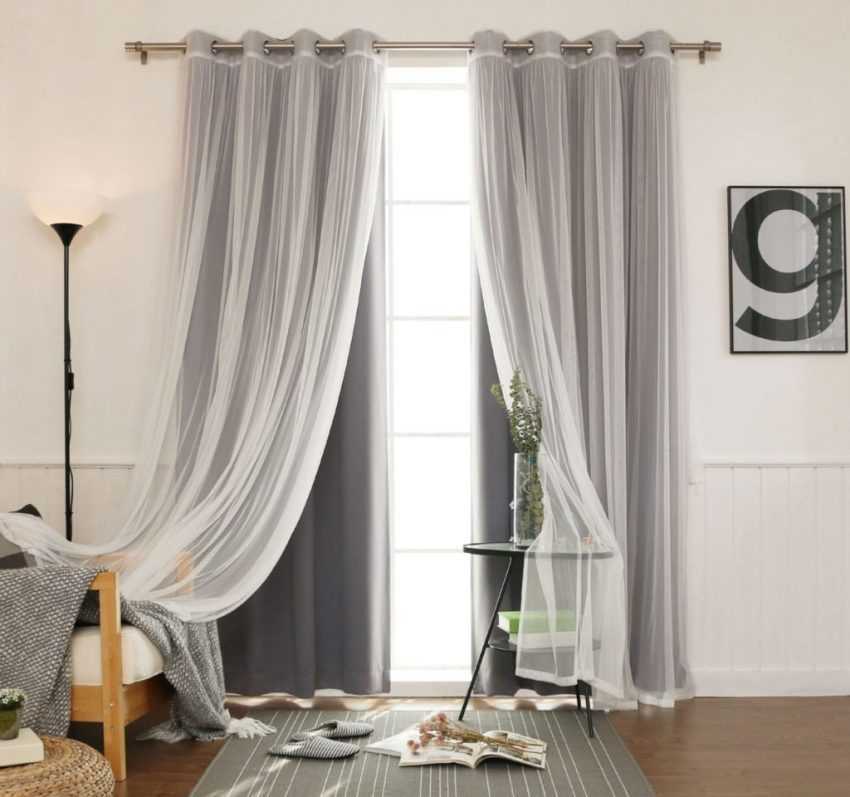 Хорошим решением станет одновременное использование гардин и тяжёлых штор на люверсах. Портьеры не будут пропускать свет, а тюль придаст комнате лёгкости, воздушности и элегантности.