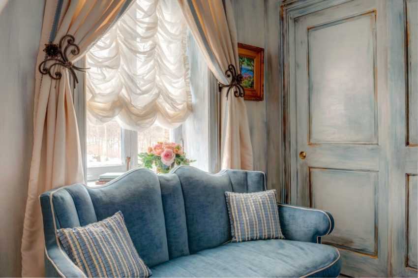 Часто встречаются в классических интерьерах. Для небольшого окошка выбирайте сочетание тюля и портьеры. Они подойдут в гостиную. Плотный текстиль занавесок должен совпадать с палитрой комнаты и на 1-2 тона быть темнее или светлее.