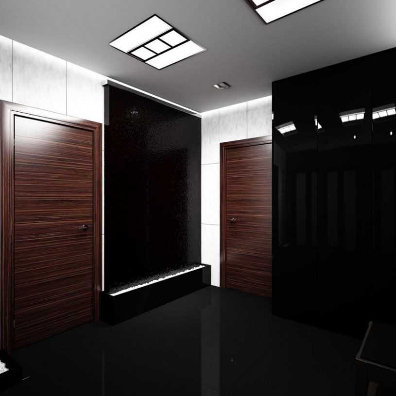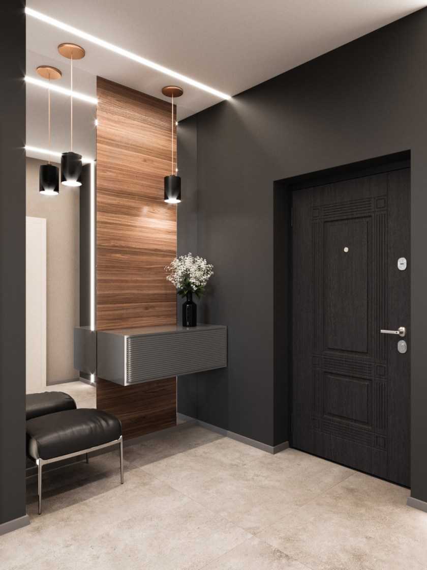 Использование темного цвета при оформлении коридора обладает многими плюсами. К ним относится: