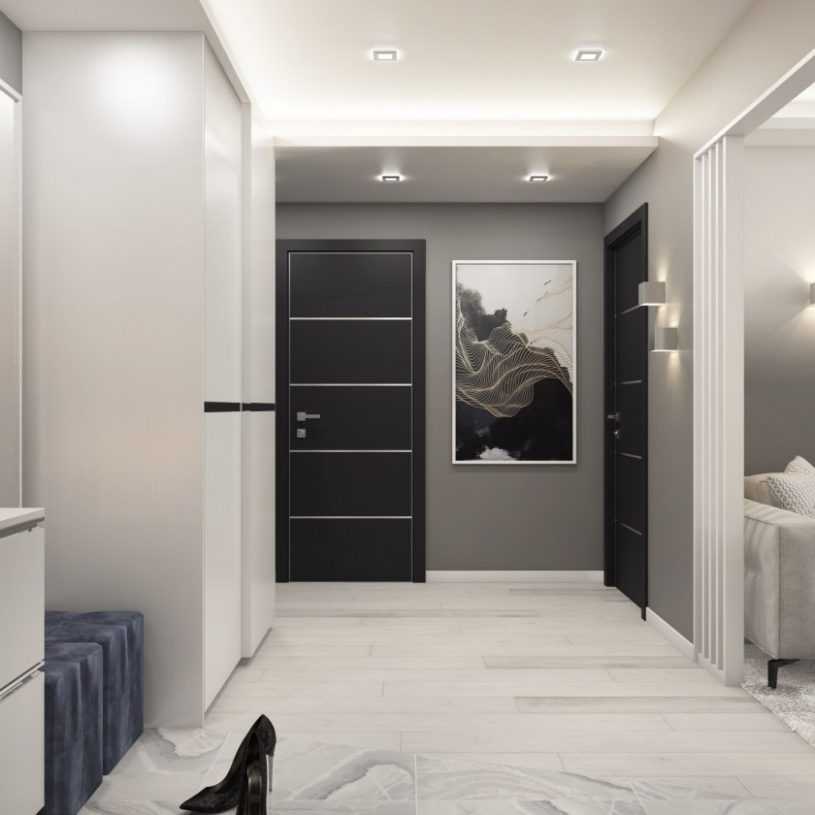 Черный дизайн прихожей должна обязательно разбавлять светлая мебель. Грубо говоря, чем глубже оттенок отделочных материалов, тем светлее должны быть двери и иные предметы комнаты.