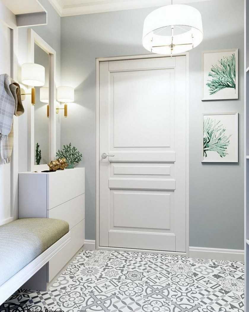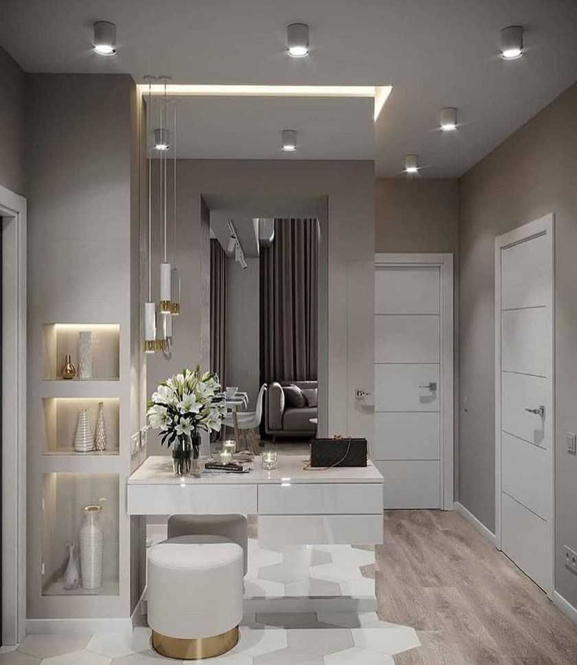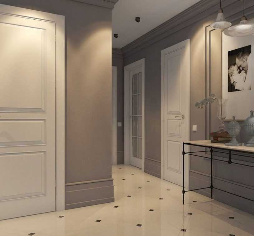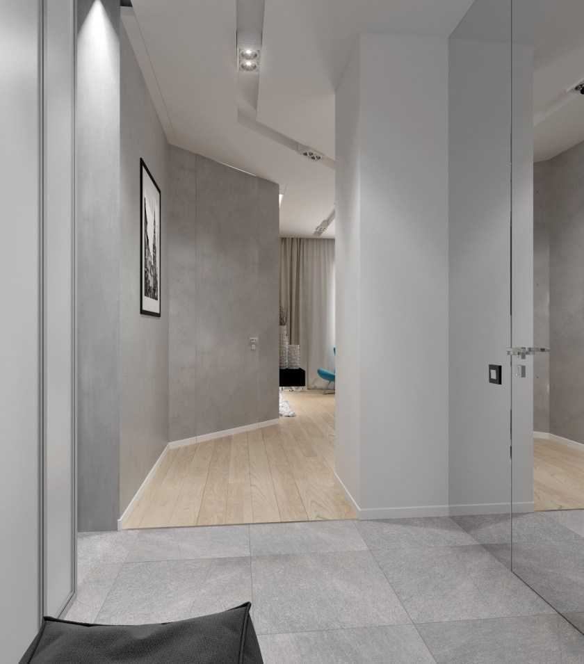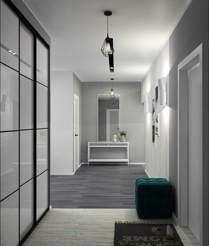 Серебряные и жемчужно-серые тона придадут коридору свет и простор, сделают дизайн элегантным и уравновешенным.