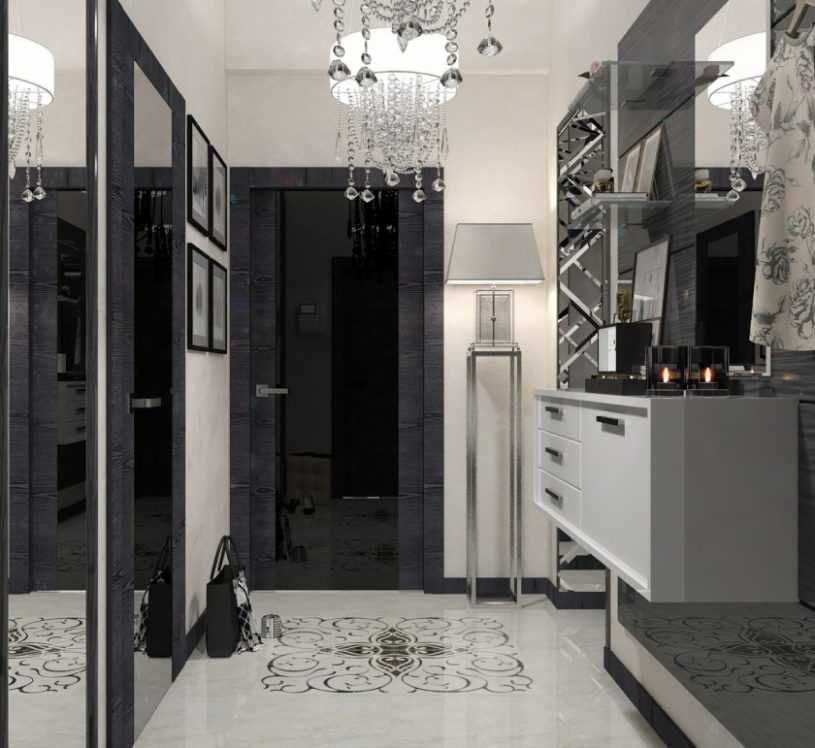 Квартиры старого образца не могут похвастаться большой площадью помещений, поэтому использовать черный цвет в отделке было бы ошибкой. Он только еще больше визуально уменьшит прихожую. Чтобы этого избежать, черный может присутствовать в цвете мебели, рамах картин, небольших боковых вставках.
