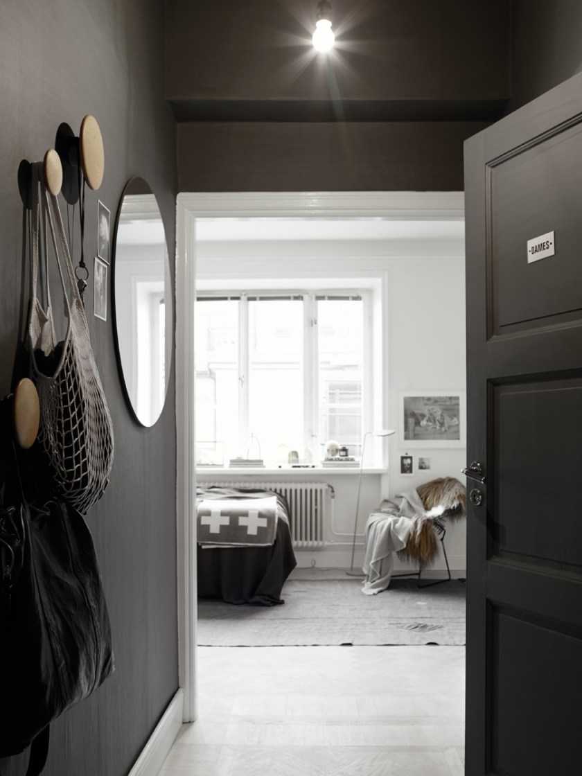 Глубина черного цвета зависит от выбранной вами поверхности. Чем больше материал, который вы располагаете на стенах поглощает свет, тем он будет более насыщенным и глубоким. Черные глянцевые прихожие получают путем нанесения краски на подготовленные стены.