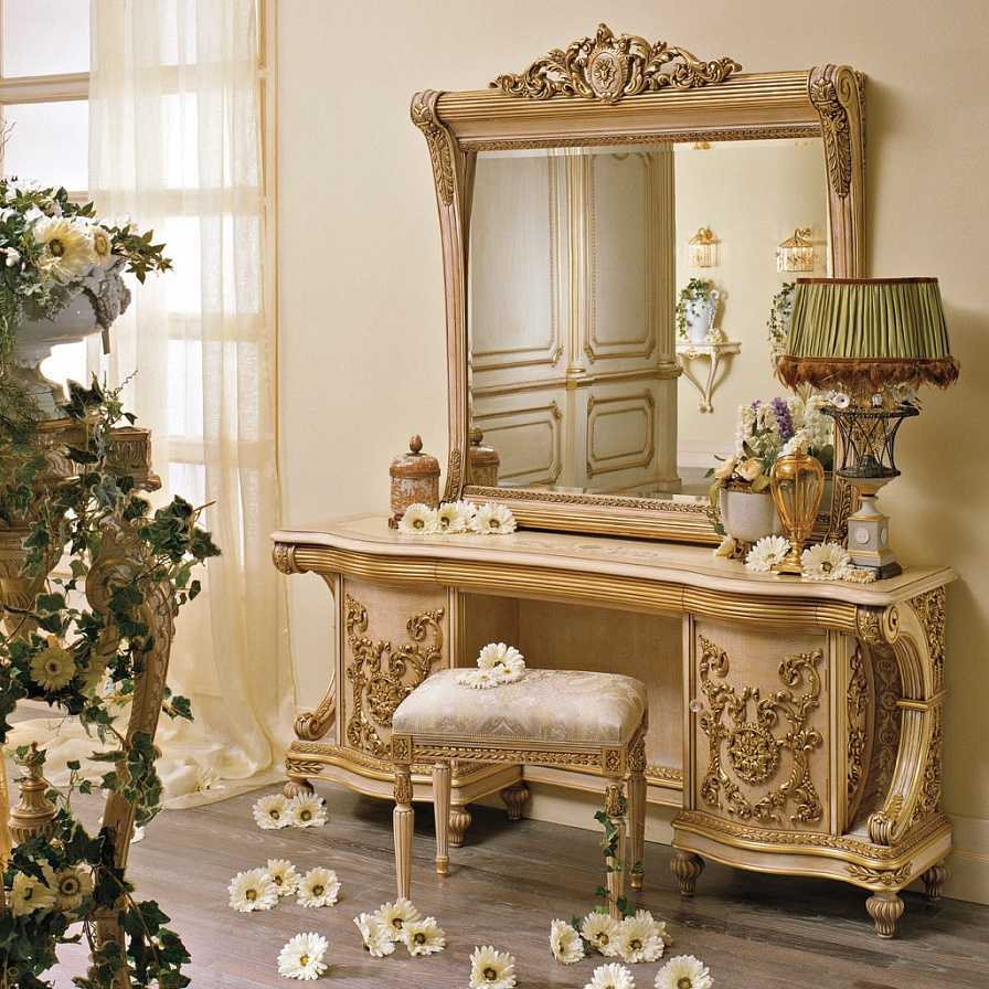 - Ничто так не подчеркивает состоятельность хозяев дома, как мебель. Этот туалетный столик полюбят те, кто привык к роскоши и максимальному комфорту. Громоздкая модель подойдет только для крупных спален. Гигантское зеркало в резной раме и внушительные габариты уравновешены кованой люстрой и изящным подсвечником.
