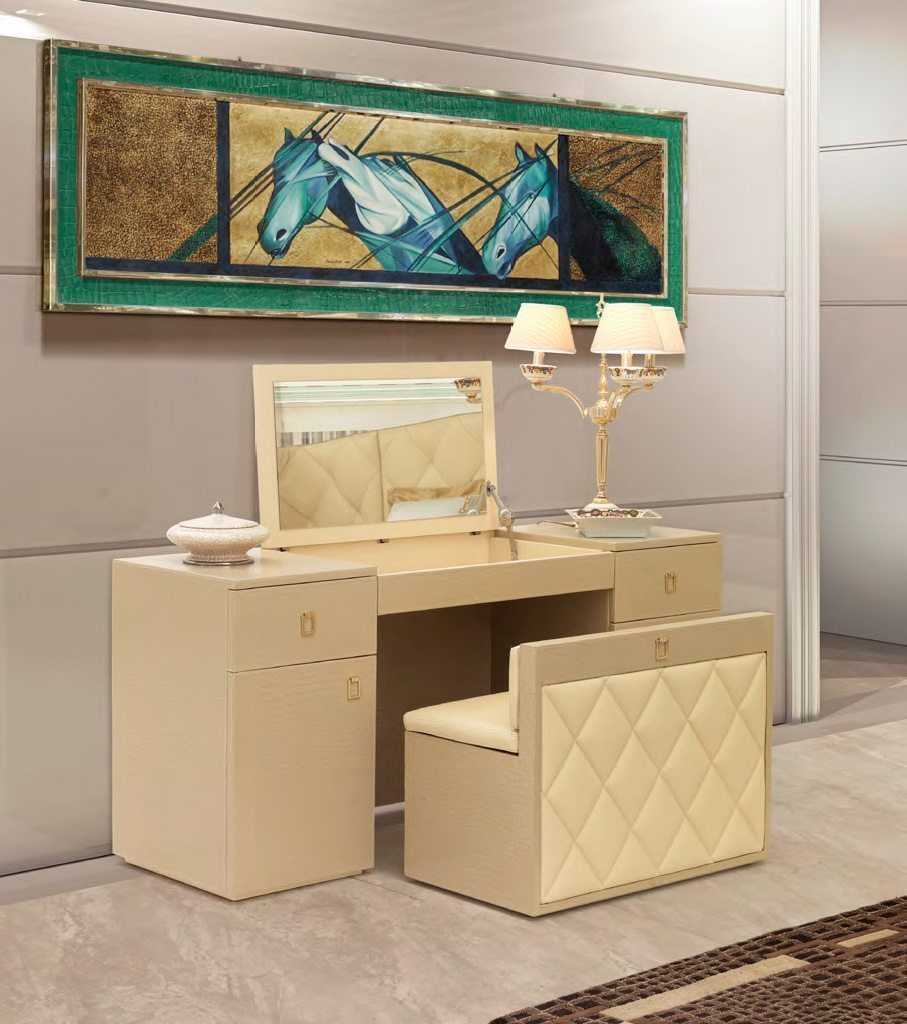 - В женской спальне такой предмет незаменим. Ведь в ящиках и на столешнице можно хранить некоторую косметику, предметы для ухода за собой, а зеркало и удобный пуф или кресло делают обстановку комфортной для наведения красоты.