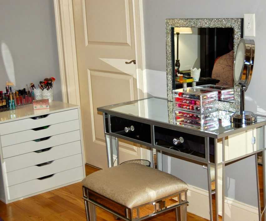 - выбрать туалетный столик или комод высотой, которая позволит вам делать макияж в сидячем положении,