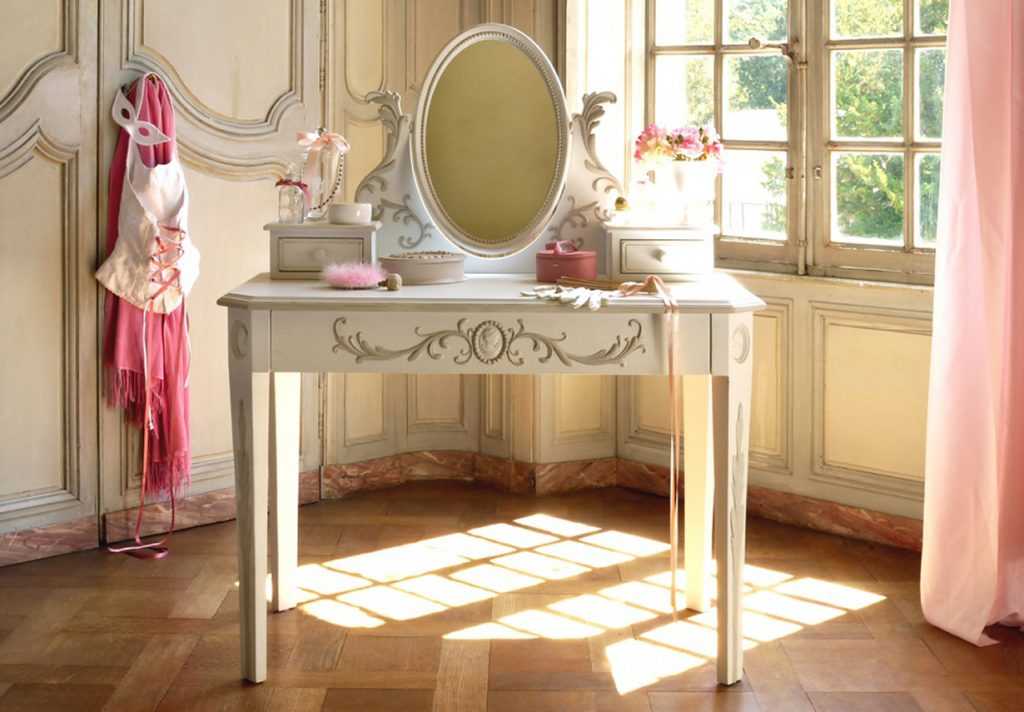 Туалетный столик, практически невозможно представить без зеркала. Оно, может быть скрыто в крышке консоли, иметь раскладной механизм или представлять собой отдельный аксессуар.