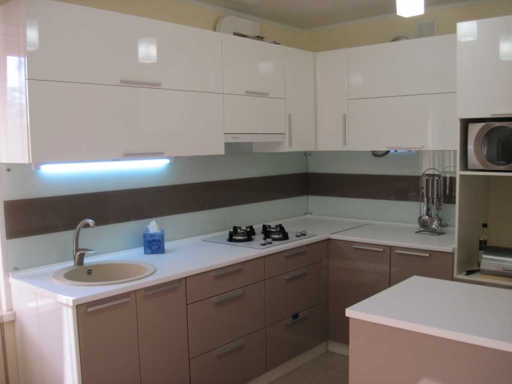 В скромной по площади комнате можно сделать тёмные и светлые фасады глянцевыми. Отражающие поверхности помогут визуально расширить границы помещения. Уравновесить двухцветную комбинацию поможет включение третьего цвета, для чего подойдёт столешница или кухонный фартук. Такое дополнение смягчит слишком контрастное сочетание основных оттенков, что всегда приятно для глаз.