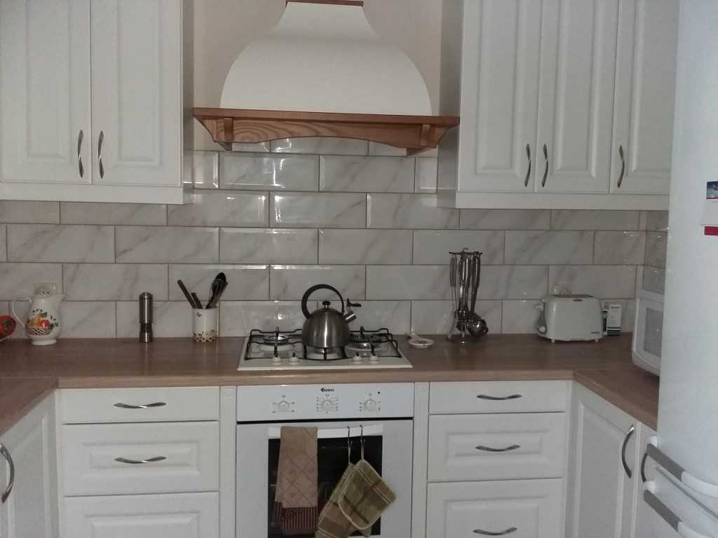 На фото вишневый фартук из плитки гармонично вписывает в пастельную гамму.