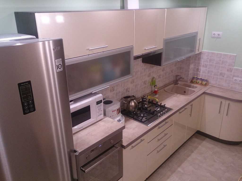 - Кухня с ванильными фасадами осветляет помещение, делает его визуально больше. Глянцевые фасады обладают дополнительным бонусом: грязь и пыль на них практически не видны.