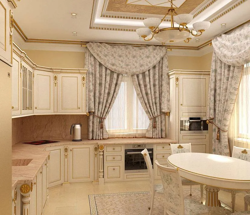 Оформление классического интерьера кухни невозможно без использования дорогого текстиля. От идеи драпировки стен тканью придется отказаться из-за непрактичности, однако текстиль широко применяется в оббивке мебели, для декорирования окон.