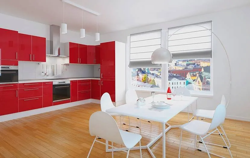 Основа всего здесь – простая геометрия, никаких замысловатых округлостей, завитушек, вензелей. Подходящие материалы – МДФ, матовое стекло, плиточные материалы. Гарнитур обычно делают красным, пол черным, стены – серыми, бежевыми. Рулонные шторы на окнах сделают оформление завершенным.