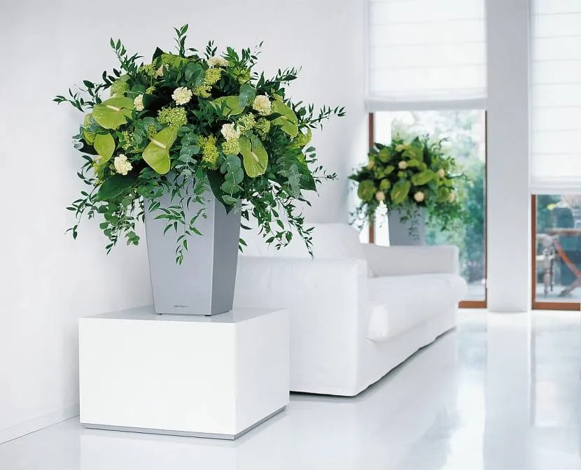 Напольные горшки с комнатными деревьями или растениями прекрасно смотрятся по углам гостиной. Кроме растений в массивных больших горшках, есть еще идея устанавливать специальные стойки под цветочный каскад или симметричную группу. На таких стойках размещается достаточно много небольших горшков с живыми цветами.