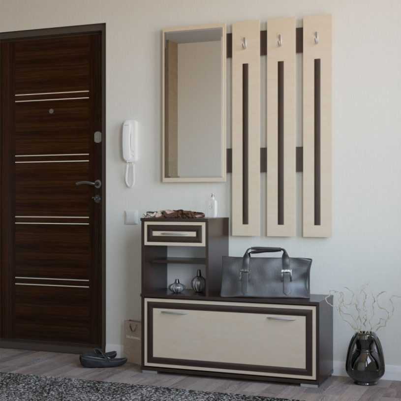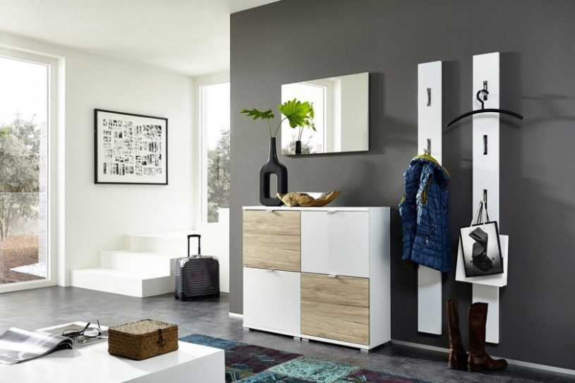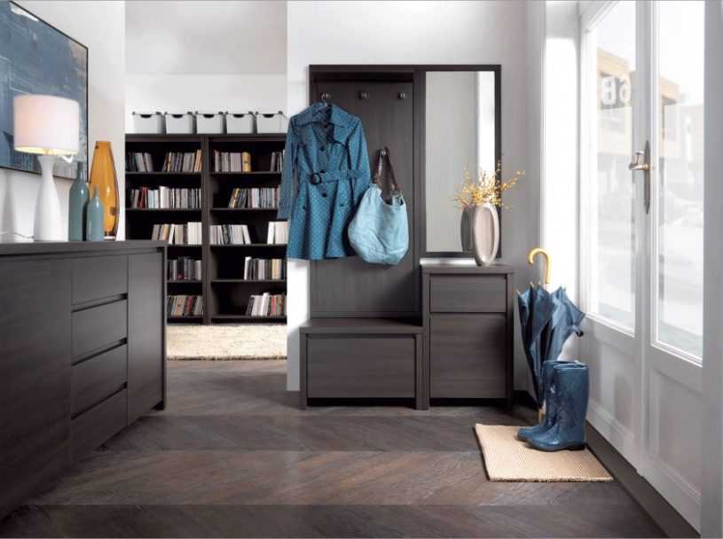 Привычный набор мебели: шкаф для верхней одежды, открытая вешалка или крючки для повседневных вещей, решетка для грязной обуви и полка для сухой или узкая обувница (шкаф для обуви), тумбочка или комод для хранения мелочей.