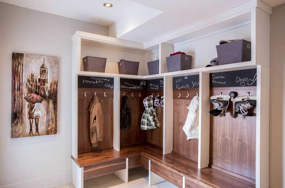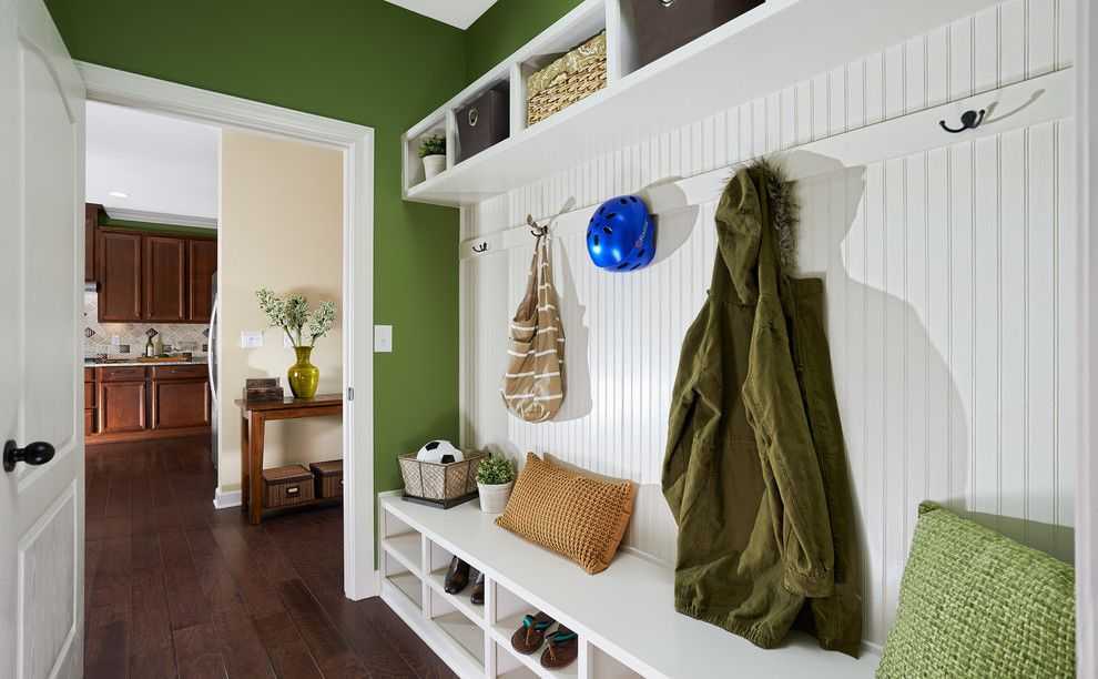 Современный – встроенный шкаф с множеством полочек, крючков, вешалок, зеркало в полный рост, длинная узкая кушетка. Пол во входной зоне оформляется ламинатом, вестибюльная часть – ковролином контрастного цвета. Потолок натяжной, пастельной расцветки.