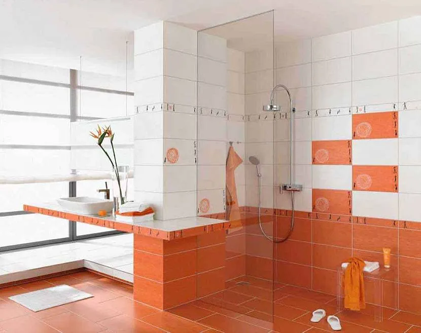 Ванная с оранжевым кафелем и живыми цветамиИсточник klinkerplitka.ru