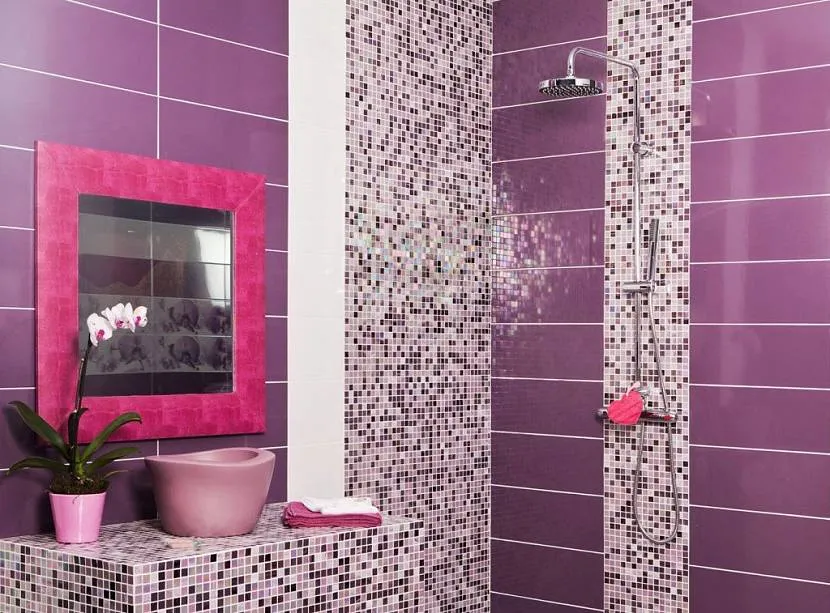 Ванная с душем может облицовываться сиреневой плиткой, уложенной горизонтально. Как вариант, такие стены удачно комбинируются с помощью пиксельной отделки. Последнюю кладку можно применить для участка за душевой стойкой, при оформлении умывальника и маленьких участков стен.