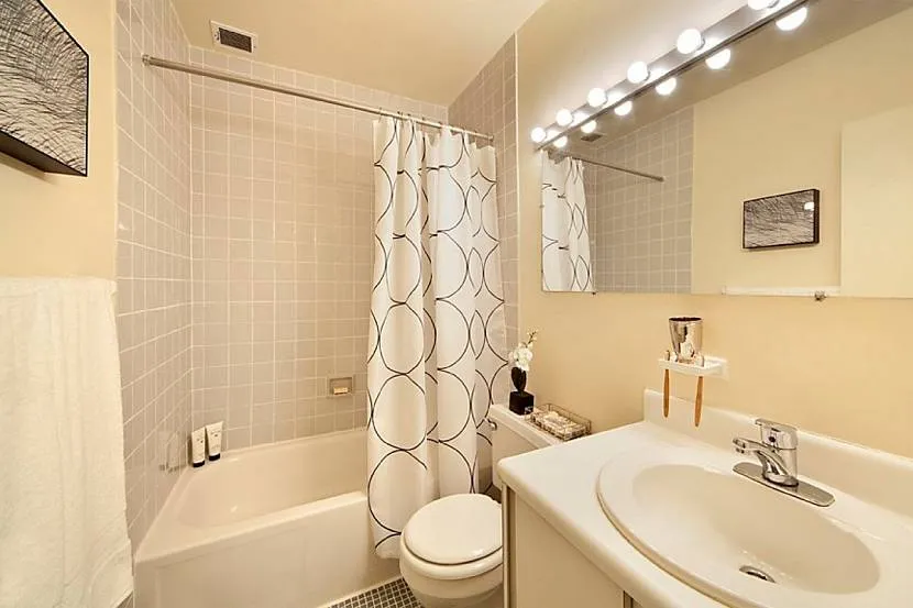 Лаконичный черно-белый дизайн с современной сантехникой обтекаемой формы. Для хранения предусмотрено два больших высоких пенала и навесной шкаф с зеркальным фасадом. Через оконный проем днем проникает естественный свет, при желании можно включить дополнительные источники. Горизонтальные черные линии придают строгость и стиль.