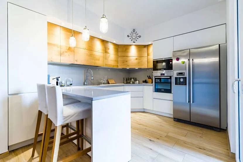 Важный нюанс — размещение холодильника. Он является частью рабочего треугольника, поэтому поставить в любое свободное место не получится, расположение нужно продумать. Специалисты советуют устанавливать холодильник на одну сторону, а плиту, мойку и рабочую поверхность — на другую. Также удобно встроить холодильник в стену из колонн, спрятав в них же духовой шкаф и микроволновку.