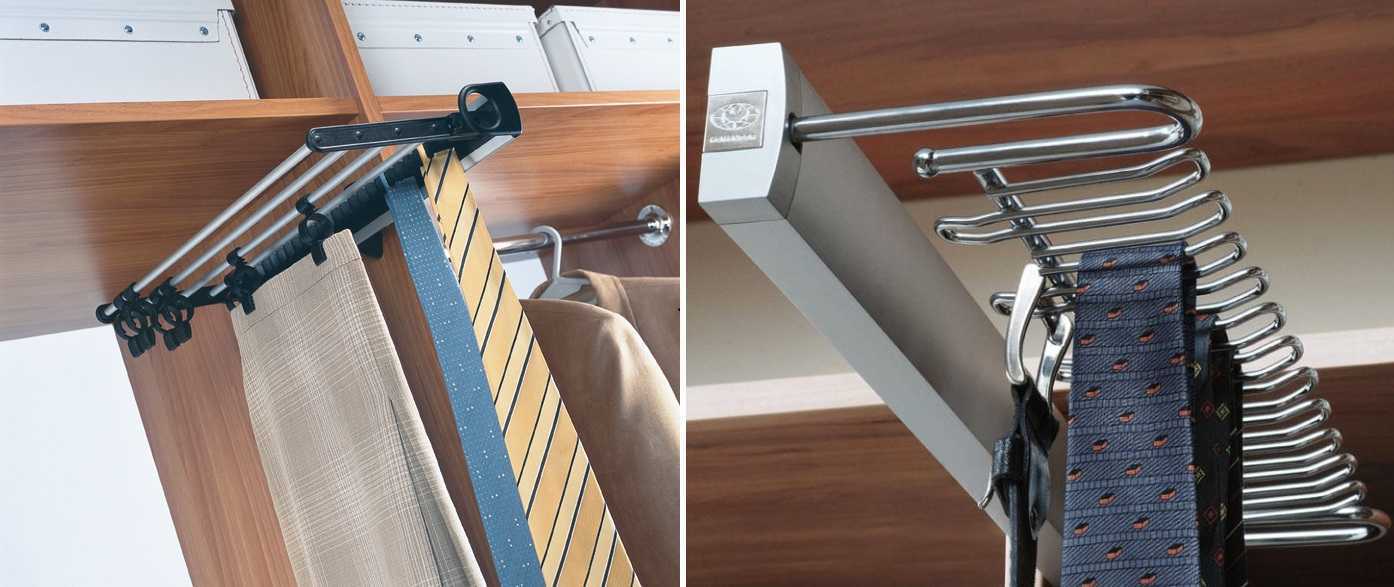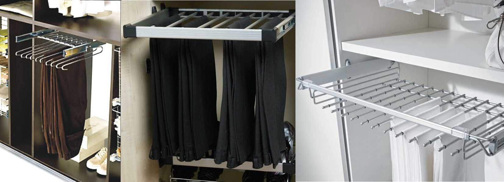 - Брючницы. Выдвижные или неподвижные держатели, предназначенные для быстрого и удобного хранения брюк.