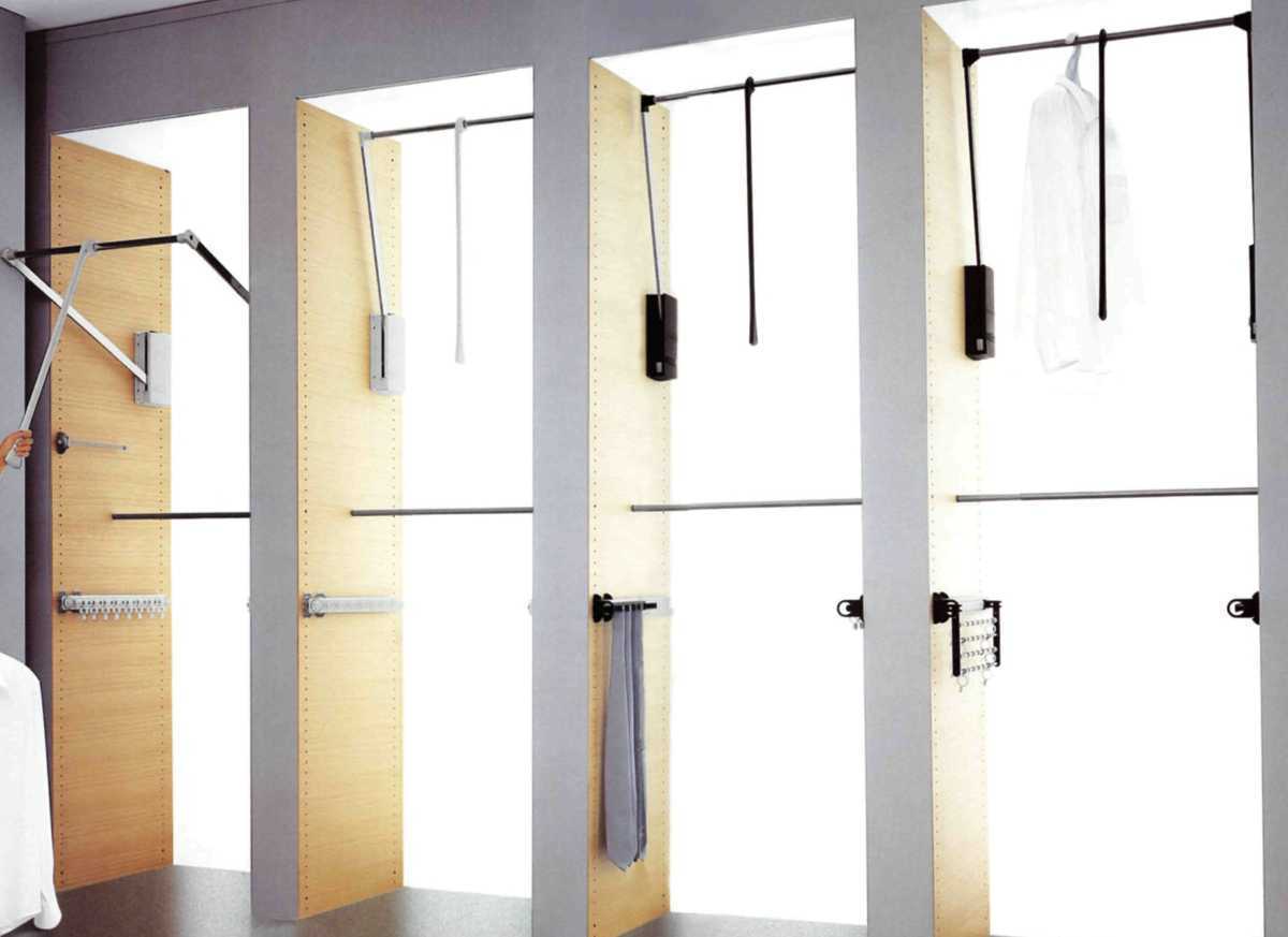 Часто удобнее размещать отделения для одежды на вешалках вверху шкафа, оставив низ для полок и ящиков. При этом ставят не обычные, а подвижные шпалы. Это устройство для наполнения шкафов называется «пантографами».