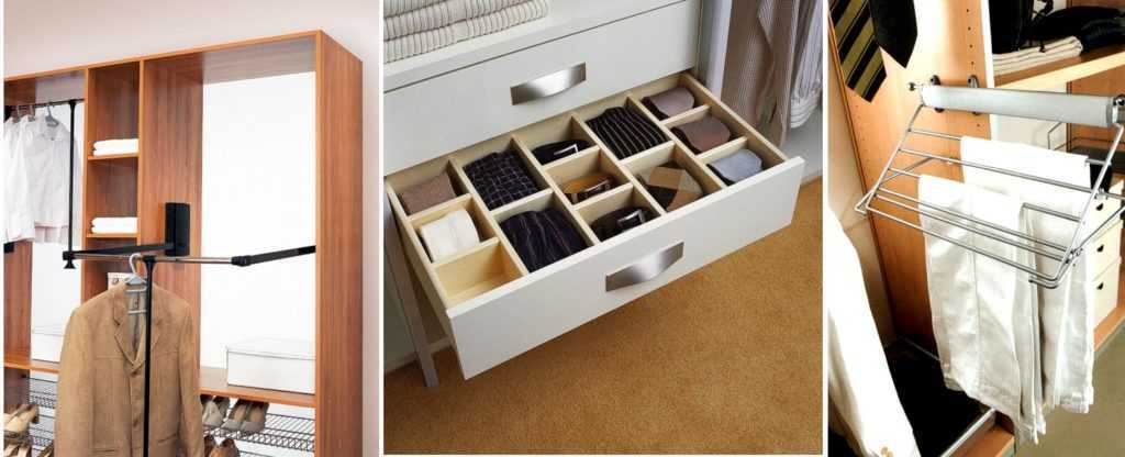 Планируя шкаф внутри для расположения атрибутики к мужским костюмам (галстуки, ремни), можно использовать ячеистые короба полного выдвижения или вытяжные металлические держатели. Удобны обувные корзины из сетки, но их не следует располагать у самого пола. Внутришкафовые лифты призваны освоить потолочную зону внутреннего объема. Их применяют в высоких панельных конструкциях.