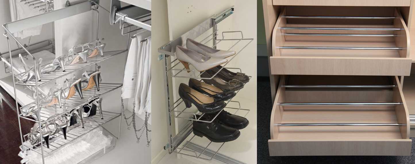 В большинстве случаев в шкафу не хватает места. Хотя и адекватного размера. Поэтому начинку шкафа-купе стараются разработать так, чтобы имеющиеся объемы использовались рационально. Например, вместо традиционных обувных полок (сетка или ДСП) можно поставить выдвижной обувной шкаф. Они отлично сочетаются с обувью с заниженной талией: туфлями, босоножками, сапогами.