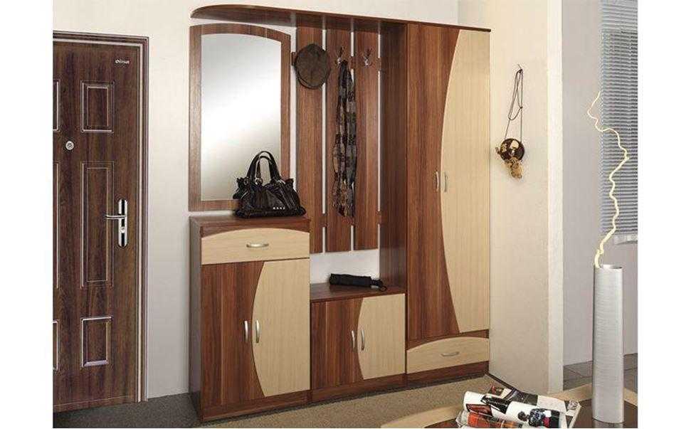 - для маленькой прихожей в хрущевке подойдет угловой шкаф, располагающийся напротив входной двери. Он вмещает и место для хранения, и крючки для верхней одежды ежедневного пользования. Такой комплект удобен при наличии в нем мягкого пуфика;