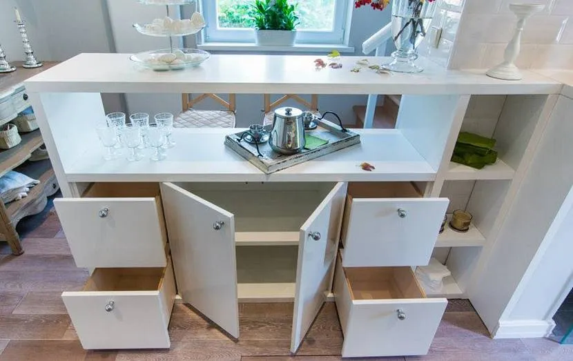 - Можно нарастить верхнюю часть, оборудовав сквозные полки — получится прекрасный «разграничитель» зон.
