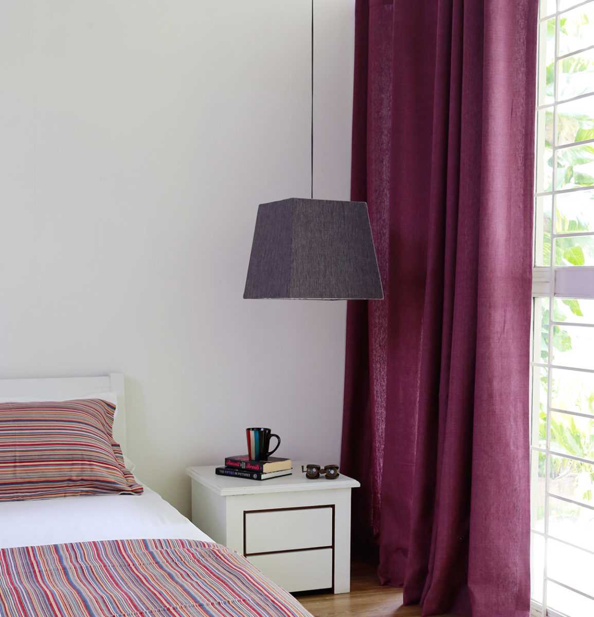 На фото портьеры из небеленого льна в современном интерьере спальни, который является натуральным материалом и не накапливает пыль.