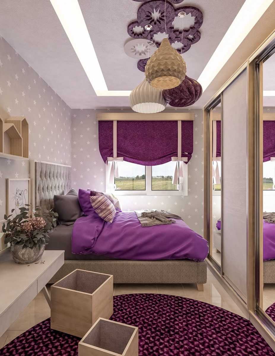 Если вы хотите оригинальности, оформите интерьер в тёмном или насыщенном цвете, подобрав шторы в цвет стен, покрывала и ковра. Более сдержанный вариант – комната в бежевых или серых тонах.