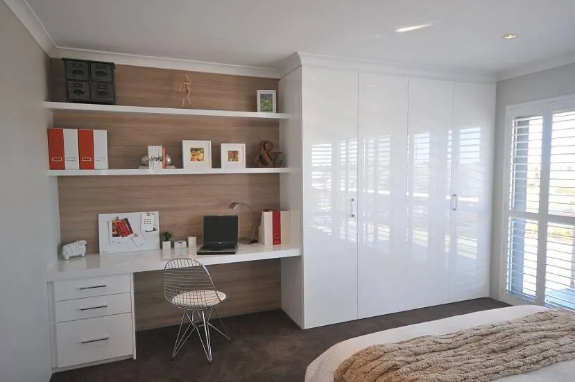 Есть мебельные компании, которые выпускают под заказ шкафы со встроенным внутри столом. Такое рабочее место легко прячется в шкаф и создает целостный вид спальни.
