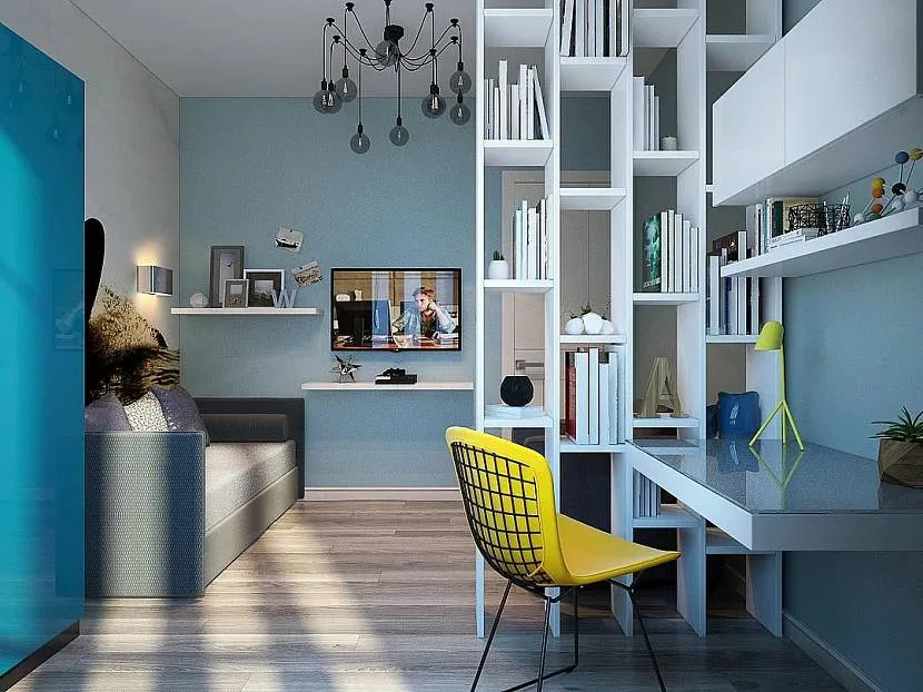 Для совмещенной спальни и гостиной можно использовать полку как перегородку