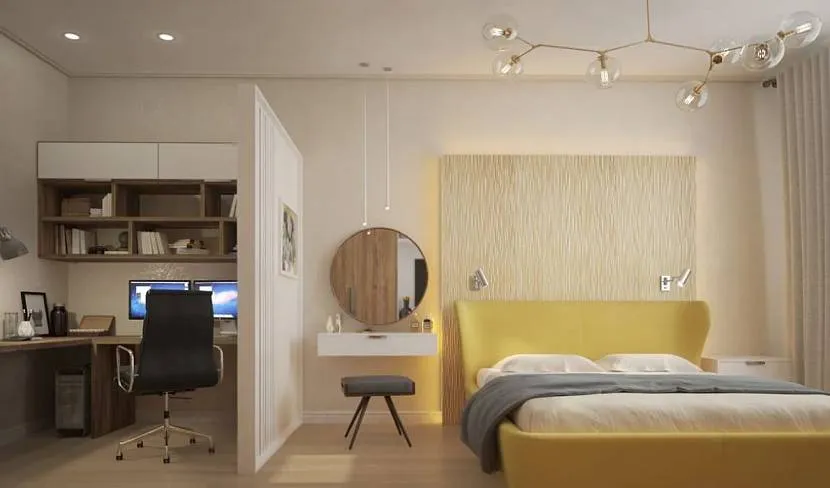 Чтобы стол для работы гармонично вписывался в спальню, необходимо соблюдать принципы зонирования пространства. Есть несколько способов, которые применяют дизайнеры, чтобы разделить комнату на спальную и рабочую зоны: